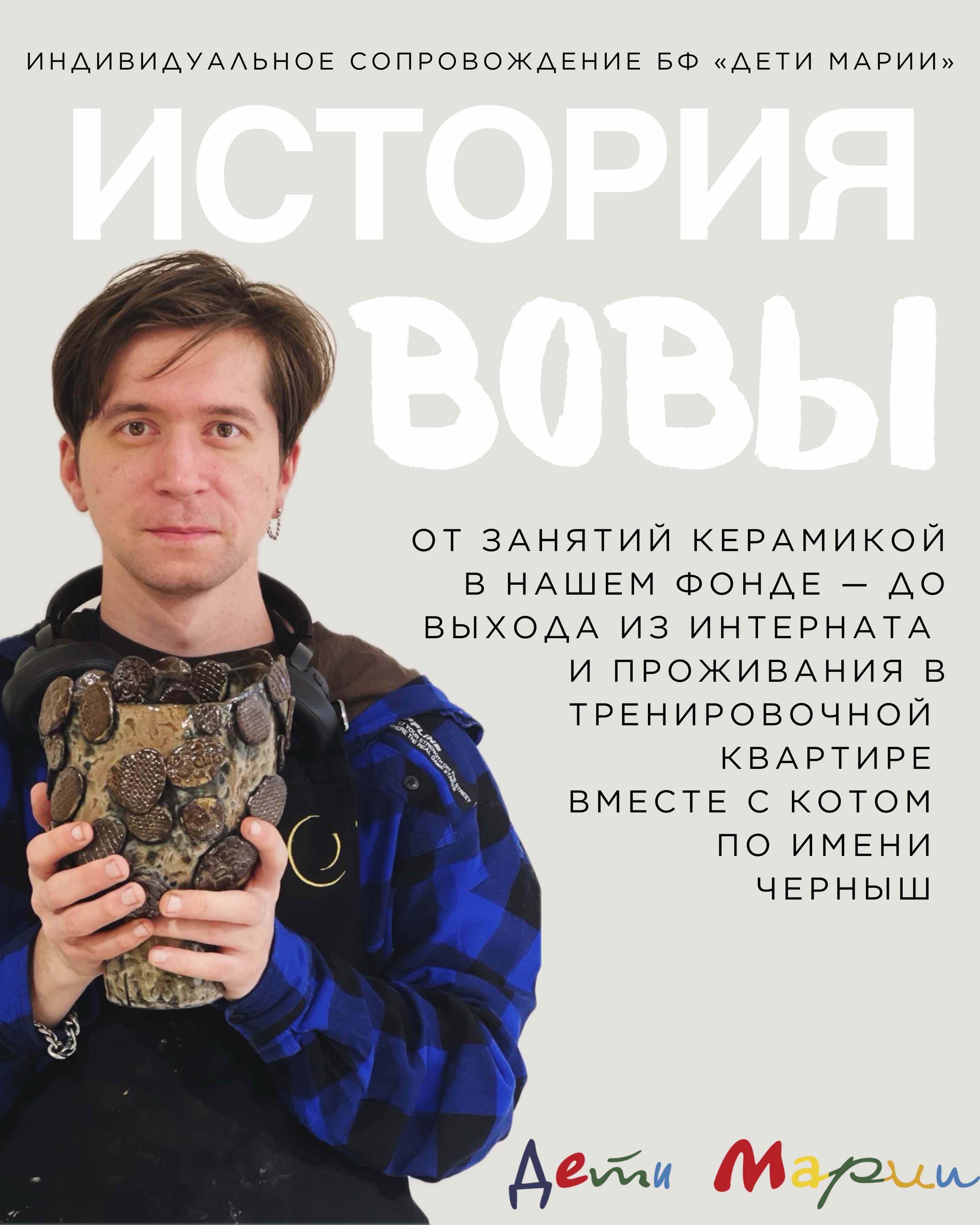 От участия в занятиях керамикой фонда «Дети Марии» до сопровождаемого проживания в тренировочной квартире вместе с котом по имени Черныш — такой путь прошел один из наших участников, 28-летний Вова.