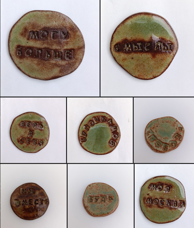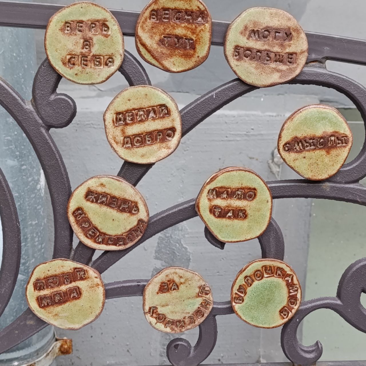Такие разные надписи и ещё много других — и серьёзных, и смешных, и милых — на свежеиспечённых керамических магнитах от инклюзивной мастерской. Участники сами придумывали и набирали надписи, так что возможны некоторые огрехи в орфографии