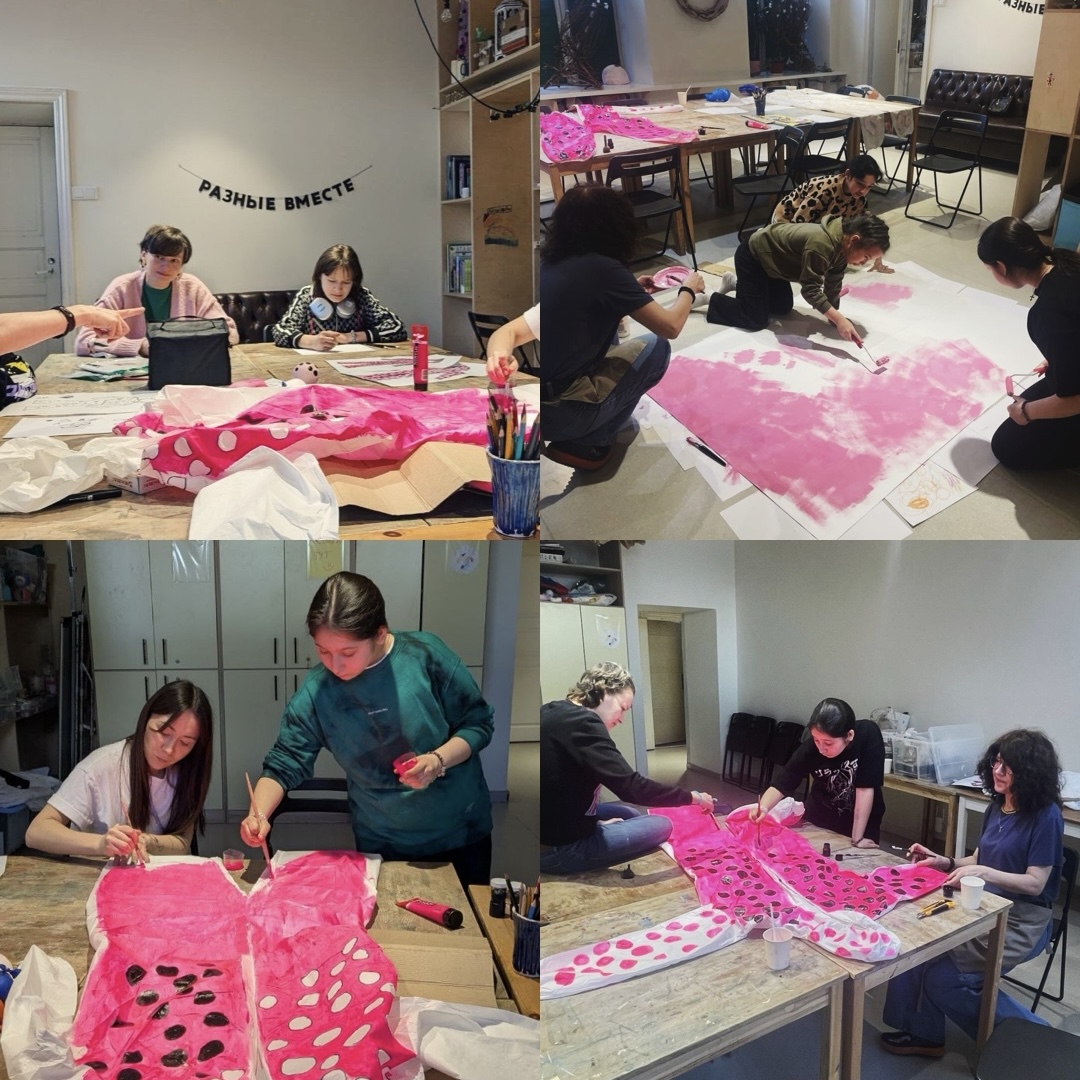 Детям предложили создать собственный костюм, вдохновившись работами Кусамы. И вот уже несколько занятий подряд мы с головой в процессе: придумываем паттерны, вырезаем и раскрашиваем. А розовые полотна на фото — это фон, который для одной участницы дружно раскрашивали всей группой.
