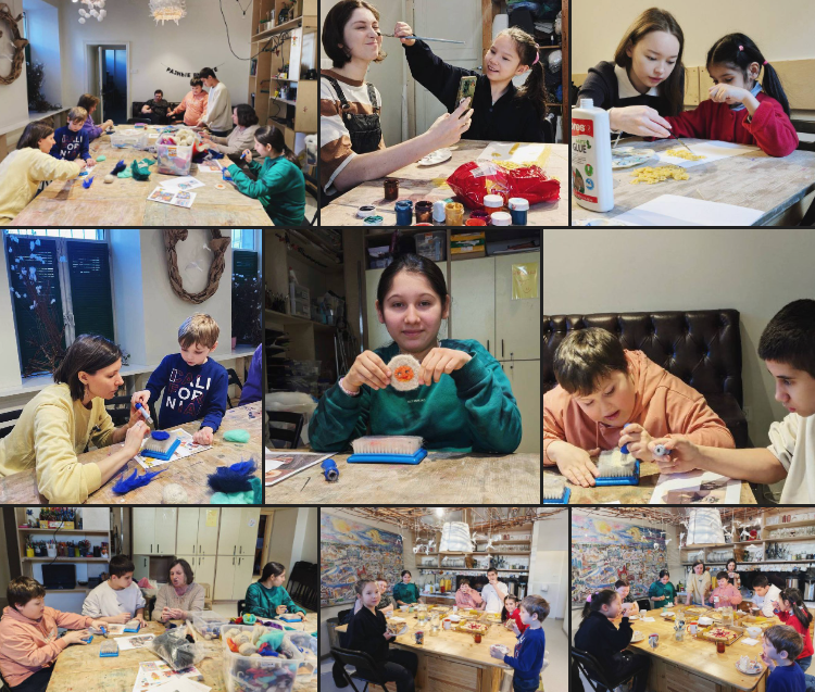 Кто занимается в «Арт-лаборатории»? Напомним, что к нам на занятия приезжают ребята из центров содействия семейному воспитанию (ЦССВ), на фото как раз — дети из ЦССВ «Радуга»: одна группа осваивает сухое валяние из шерсти вместе с Марьей Ивановной, а вторая — делает картины из разных макаронных изделий