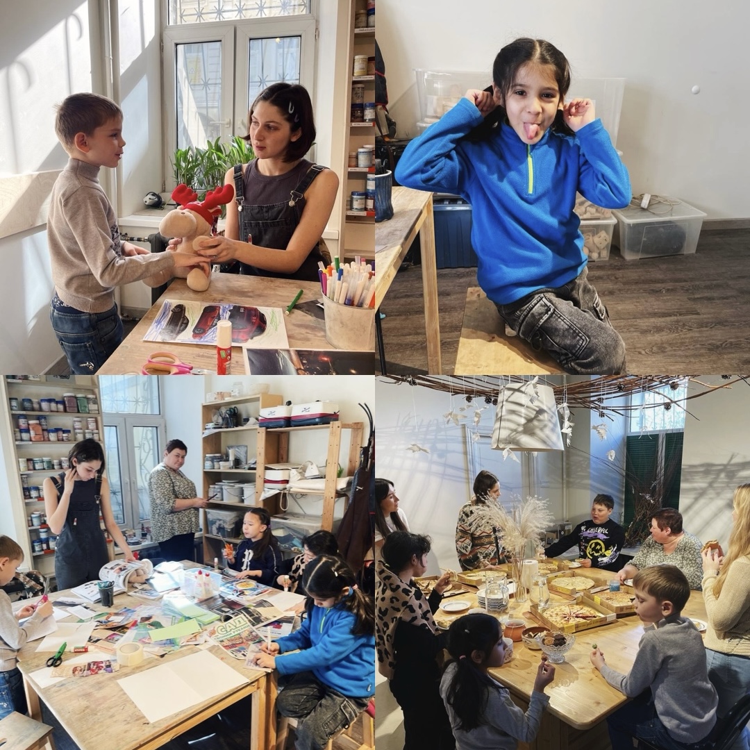 В ход идут журналы, вырезки, собственные рисунки… И все пространство вокруг. Режем, рисуем, клеим — на столе, за столом и, конечно, под столом!